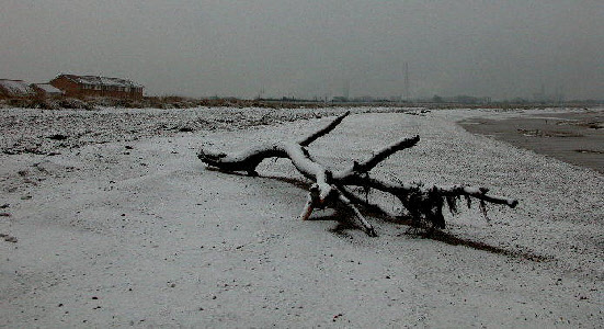 A bank of freezing fog forms over the snow covered Northwick Warth.